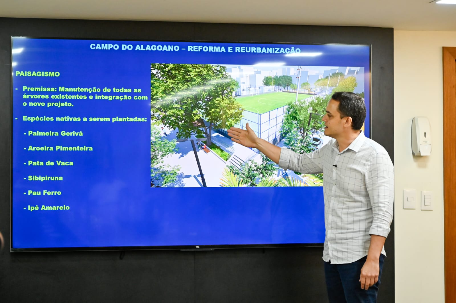 Durante a apresentação do projeto, o prefeito detalhou os novos equipamentos: “olha que coisa bacana: local para pessoas de todas as idades, com rampa, corrimão, iluminação. Local para estacionamento ordenado, área arborizada, climatização nas áreas administrativas, salão de festa para a comunidade. Vamos plantar espécies nativas, aumentando o número de árvores para trazer conforto térmico”.