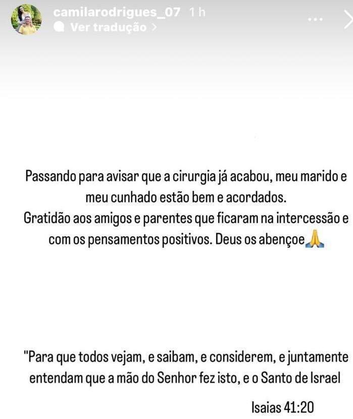 “Meu marido e meu cunhado estão bem e acordados. Gratidão aos amigos e parentes que ficaram na intercessão e com os pensamentos positivos. Deus os abençoe”, escreveu Camila.